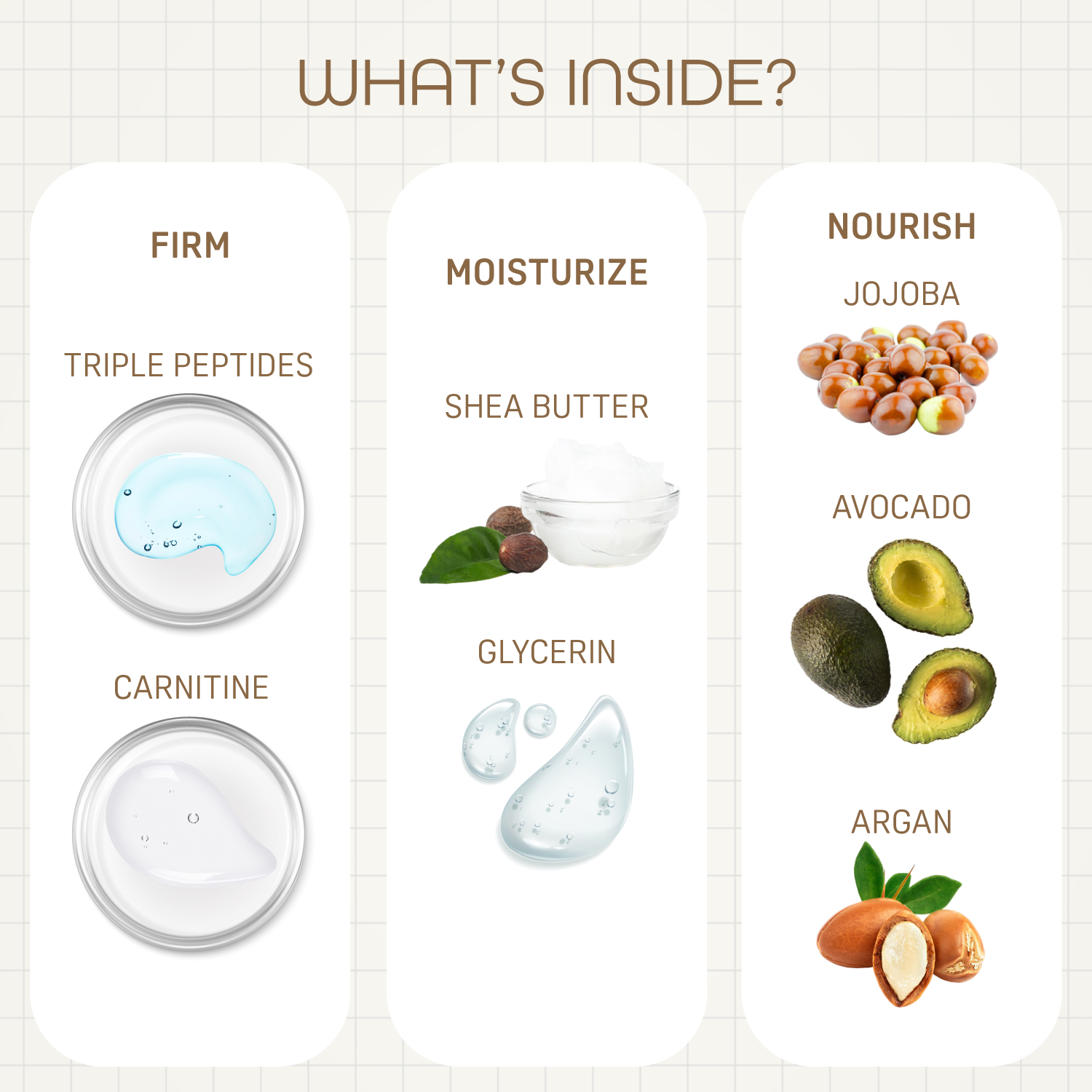 - Carnitine: Breaks down fat cells to visibly reduce cellulite.