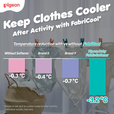 Keep little clothes soft, cool, and comfy with Pigeon Baby Fabric Softener. Its Fabric Cool formula lowers fabric temperature by up to 3.2°C for added comfort, while 99.99% antibacterial protection keeps garments fresh and clean. Free from harsh chemicals and dermatologically tested, it’s a gentle, newborn-safe choice for everyday wear.